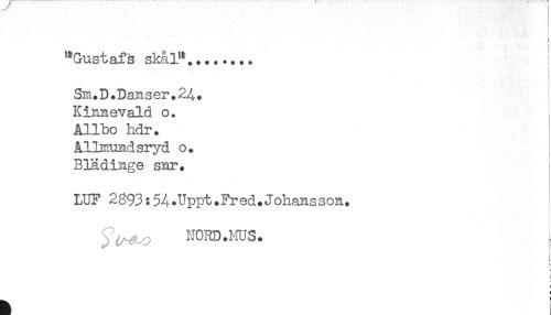 //// ''Gustafs skål"........ ! //// Sm. D.Danser. 2^. //// Kinnevald o. //// Allbo hdr. //// Allmundsryd o. //// Blädinge snr. //// LUF 2893:54^Uppt.Fred.Johansson. //// t //// ^ NORD .MUS. I //// ! //// [ //// [ ////