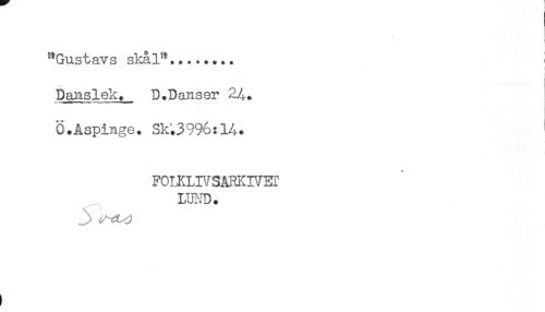 //// "Gustavs skal**........ < //// Danslek. D.Danser 2^. //// Ö.Aspinge. Sk^3996:14. //// FOIKLIVSARKIVEr //// LWD. //// .. . c ^ ////