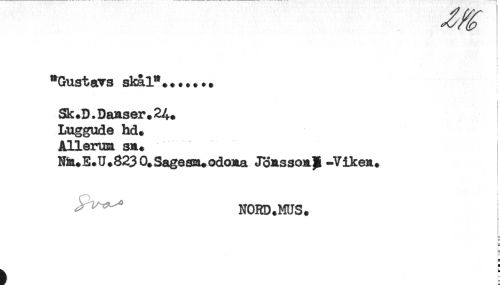 //// f //// [ //// "Gustavs skål"....... //// Sk.D.Danser.24. //// Luggude hd. //// Allerum sn. //// Nia.E.U.823 O.S^esm.odo^a JoRssOA^-VikeA. //// t //// NORD. MUS. //// i //// r //// F //// H ////