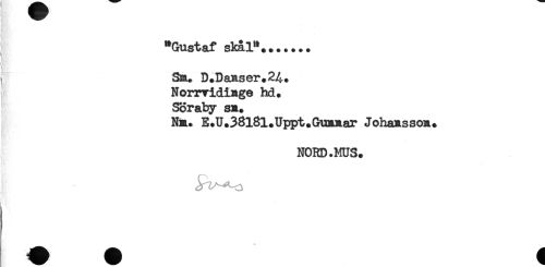 //// "Gustaf skål"....... //// } Sa. D+Danser+24,. //// Norrvidinge hd. //// Soraby sn. //// Nn. E^U.38l8l.Uppt.Gtomar Johansson. //// NORD.HUS. ////