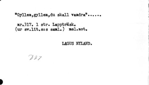 //// ! //// "Gyllen,gyllen,du skall vandra"*..... //// } //// nr*317* 1 str. Lapptrask. //// (ur sv.lit.srs saml.) nel.not. //// LAGUS NYLAND. ////