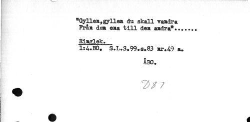 //// "Gyllen,gyllen du skall vandra //// Från den ena till den andra"....... //// Ringlek. //// 1:A.B0. S.L.S.99.S.83 nr.A9 a. //// ÅBO. ////