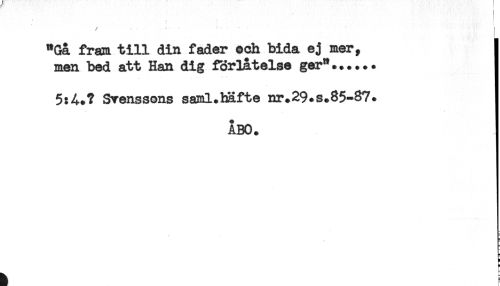 //// / ....... //// "Gå fram till din fader och bida ej mer, //// men bed att Han dig förlåtelse ger"...... //// 5:4.? Svenssons saml.häfte nr.29.s.85-87. //// ÅBO. ////
