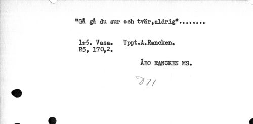 //// f l * - //// "Gå gå du sur och tvär,aldrig*........ //// 1: 5. Vasa. Uppt.A. Rancken. //// R5^ 170,2. //// ÅBO RANCKEN MS. ////