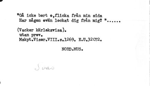 //// "Gå icke bert o,flicka från min sida //// Har någon evan lockat dig från mig? *...... //// ! //// (Vacker kärleksvisa), //// utan prov. //// Mskpt.Viser.VIll.s.1269. E.U.32072. //// i //// NORD .MUS. //// i //// i ////