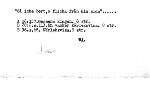 //// "Gå icke bert,o flicka från min sida".....* //// < //// A l6:137.Gessens klagan. 6 str. //// B 28:2.s.113.En vacker kärleksvisa. 8 str. //// B 36.S.68. Kärleksvisa.8 str. //// RA. //// , I A^cX. //// _______^______^^^^__._^ , ////