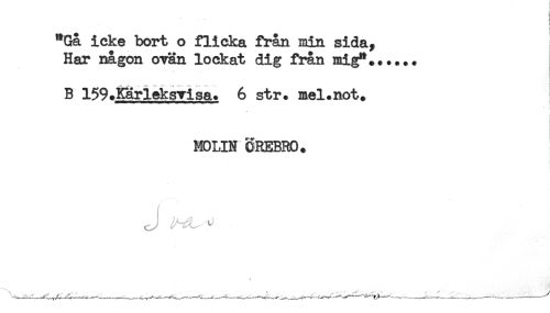 //// 'I //// I //// "Ga icke bort o flicka från min sida, //// Har någon ovan lockat dig från mig"...... //// B 159.Kärleksvisa. 6 str. mel.not. //// MOLIN OREBRO. //// J ^ ////