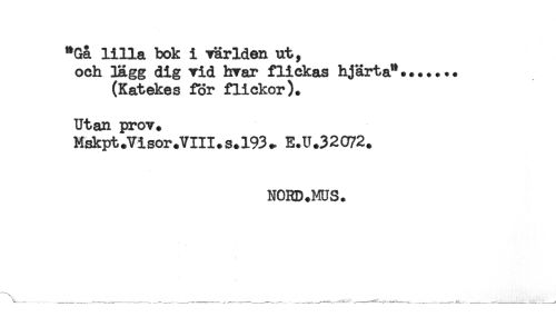 //// "Gå lilla bok i världen ut, //// och lägg dig vid hvar flickas hjärta"....... //// (Katekes for flickor). //// Utan prov. //// Mskpb.Visor.VIII.s.193^ E.U.32072. //// NORD.MUS. ////