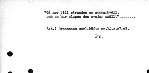 //// "Gå ner till stranden en sommarkväll, //// och se hur slupen den svajar snällt*'........ //// 6:4*? Svenssons saml.häfte nr.14.s.67-68. //// ÅBO. ////