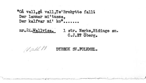 //// "Gå vall,gå vall,Te'Brohytte falU //// Der larmar mi'tussa, //// Der kalfvar mi' ko"....... //// nr. 24,+Wallvisa* 1 str. Nerke ,Hidinge sn. //// C.J.E? Oberg. //// DYBECK SV.FOLKMEL. ////