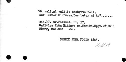 //// "Ga vall,ga vall ,Te'Brohytt e fall, //// Der lammar mintussa,Der betar mi ko"....... //// sid.37. Sv.Folkmel. nr. 17. //// Vallvisa från Hidinge sn.Nerike.Uppt.af Emil //// Oberg, mel.not 1 str. //// DYBECK RUNA FOLIO 1665. ////