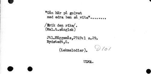 //// *Gån här pa golvet //// med edra ben sa vita**........ //// /Rrik den rikt/. //// (Hel. t. sanglek) //// Jtl.Häggenas,27A9:l s.29. //// Rydstedt,G. //// (Lekmelodier). //// UIMA. ////