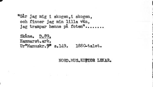 //// "Går jag mig i skogen,i skogen, //// och finner jag min lilla vän, //// jag trampar henne på foten"........ j //// ! //// Skåne. D.89. ! //// Hammarst.ark. ? //// Ur"Manuskr.?" s.H9. l88CLtalet. [ //// t //// E //// B //// E //// N03D.MUS.K0PI0R LEKAR. //// g //// ! //// ] //// — //// ! //// t ! ////
