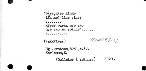 //// "Gåsoygase ginge //// lan mej dine vinge //// A Hp //// köper bama nye sko //// nye sko mä spänne"*..... //// (V^isa.) //// Ögl.Drothem,6751,s.37. //// Karlsson,E. //// (Gullskor å spänne.) UINA. ////