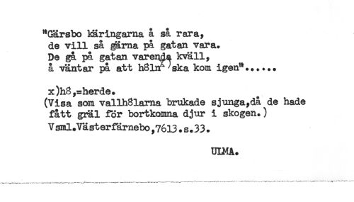 //// "Gärsbo käringarna å så rara, //// de vill så garna på gatan vara. //// De gå på gatan varenda kväll, //// å vantar på att hSlnf^ska kom igen"...... //// x)h8,=herde. //// (Visa som vallhSlama brukade sjunga,då de hade //// fått gräl för bortkomna djur i skogen.) //// Vsml.Västerfärnebo ,7613 . s.33 . //// ULMA. ////