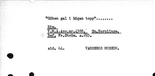 //// "Göken gal i högan topp"........ //// Rim. //// V .M.A.Acc.nr.4388. Sn.Harplinge. //// # Ref. Fr. Ström. s.293^ //// sid. 64. VARBERGS MUSEUM. ////
