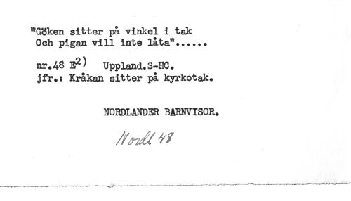 //// "Göken sitter på vinkel i tak //// Och pigan vill inte låta".....* //// nr.48 E^) Uppland. S-HC. //// jfr.: Kråkan sitter på kyrkotak. //// NORDLANDER BARNVISOR. ////