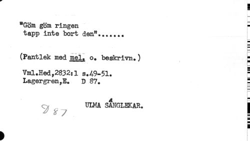 //// ! //// ) //// [ //// "Göm göm ringen - //// tapp inte bort den"....... //// (Pantlek med mel, o. beskri vn.) ^ //// I— //// Vml.Hed,2832:1 s.49-51. ^ //// Lagergren^E. D 87. : //// i_ //// ULMA SANGLEKAR. ] //// ^ ^ 7 ! //// t ////