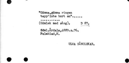 //// "Gömma, gömma ringen //// tapp'inte bort en"...... //// (Gömlek med sång). D 87. //// Sdml.Årdala,4S89.s.76. //// Parblad ,W. //// ULMA SÅNGLEKAR. ////