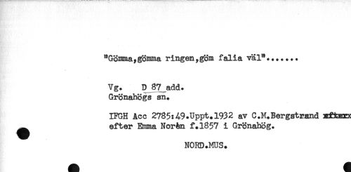 //// "Gömma,gömma ringen,göm falia väl"....... //// Vg. D 87 add. //// Grönahögs sn. //// IFGH Acc 2785:A9.Uppt.l932 av C.M.Bergstrand xfjcmex //// ^ efter Emma Norån f.1857 i Grönahög. ////