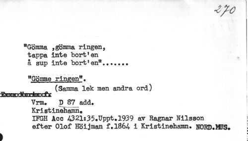 //// "Gömma ,gömma ringen, //// tappa inte bort'en //// å sup inte bort'en",...... //// "Gomme ringen". //// (Samma lek men andra ord) //// Vrm. D 87 add. //// Kristinehamn. //// IFGH Acc 4321:35.Uppt.l939 av Ragnar Nilsson //// efter Olof Hoijman f.l86A i Kristinehamn. NORD.M&S. ////