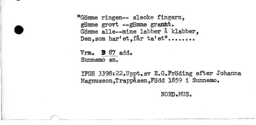 //// "Gönnne ringen— slecke fingern, //// ^ gömme grovt —gömme granht. //// ^ Gömme alle—mine labber å klabber, //// Den,som har'et,får ta'et"........ //// ^ Vrm. B 87 add. //// Sunnemo sn. //// IFGH 3398:22.Uppt.av E.G.Froding efter Johanna //// Magnusson,Trappåsen,Född 1859 i Sunnemo. //// * //// NOHD.MUS. ////