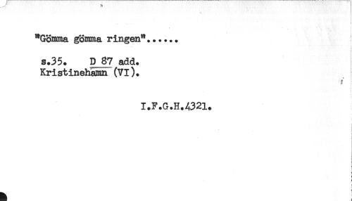 //// < t //// "Gömma gömma ringen"...... //// s //// i //// i //// ^ //// s.35. D 87 add. //// Kristinehamn (VI). //// i //// * //// t //// I.F.G.H.4321. //// i //// < //// < //// ! ////