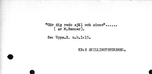 //// *Gor dig redo sjal och sinne"...... //// ( av M. Renner ) . //// Se: Upps.Z. n.h.l:15. //// KB:S SKILLIMGTRYCKSRm. ////