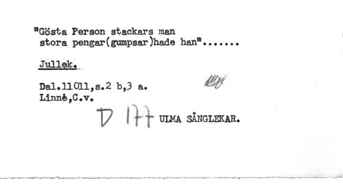 //// "Gösta Person stackars man //// stora pengar (gumpsar)hade han"....... //// Jullek. //// Dal+ll0ll,s.2 b,3 a. ^^ //// Linné,C. v+ //// i f ^ ULMA SANGLEKAR. ////