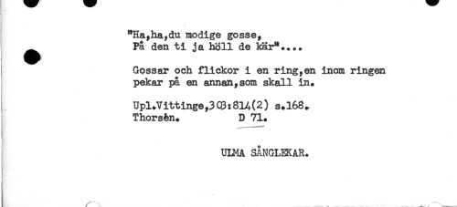 //// "Ha,ha,du modige gosse, //// På den ti ja höll de kär*.... //// Gossar och flickor i en ring,en inom ringen //// pekar på en annan,som skall in. //// Upl.Vittinge,3C3:814(2) s.168* //// Thorsén. D 71. //// ULMA SÅNGLEKAR. ////