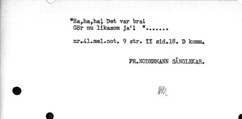//// **Ha,hayha^ Det var brat //// Gor nu likasom ja'i //// nr.Al.mel.not. 9 str. II sid. 18. D komm. //// - //// PR.NODERMANN SÅNGLEKAR. ////