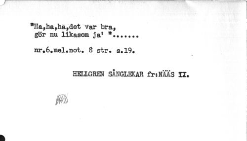 //// - — _ ^ //// *Ha,ha,haydet var bra, //// gör nu likasom ja' //// nr.6.mel.not. 8 str. s.19. //// * //// HELLGREM SANGLEKAR fr:NÄÄS H. //// ! //// t //// ! //// ! ////