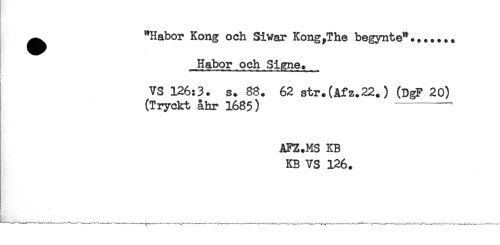 //// ^ "Habor Kong och Sivar Kong,The begynte"....... //// Habor och Signe. //// VS 126:3. s. 88. 62 str.(åfz.22.) (DgF 20) //// (Tryckt ähr 1685) ------ //// AFZ.MS KB //// KB VS 126. //// L____, _______^___. . _______ ////