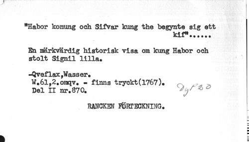 //// "Habor konung och Sifvar kung the begynte sig ett //// kif".. * * * * //// En nRrkvärdig historisk visa om kung Habor och //// stolt Signil lilla. //// -Qveflax ,Wass er. //// M.6l,2.omqv. - finns tryckt(l767). . //// Del II nr.870. ^ ^ ^ //// RANCKEH B^RTECKNING. ////