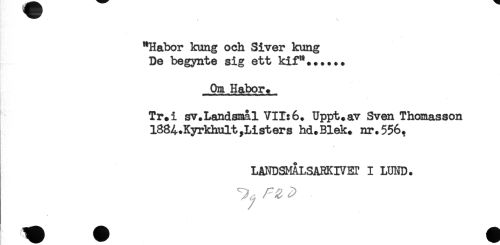 //// "Habor kung och Siver kung //// De begynte sig ett kif*+...+. //// Om Habor* //// Tr.i sv.Landsmål VII:6. Uppt.av Sven Thomasson //// lSS^.Kyrkhult,Listers hd.Blek. nr. 556, //// LANDSMÅLSARKIVET I LUIJD. ////