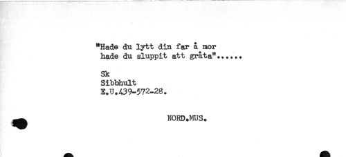 //// "Hade du lytt din far å mor //// hade du sluppit att gråta"...... //// Sk //// Sibbhult //// E.U.439-572-28. //// ^ NORD.MUS. ////