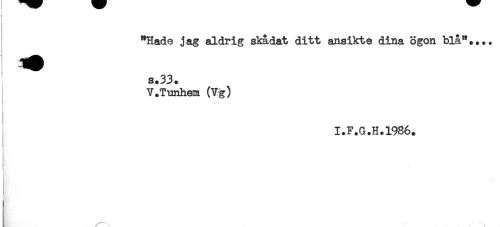 //// "Hade jag aldrig skådat ditt ansikte dina ögon blå". //// s.33. //// V.Tunhem (Vg) //// I.F.G.H.1986. //// < //// t / ////