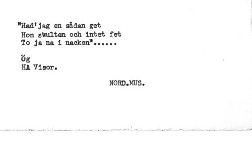 //// "Had*jag en sådan get //// Hon svulten och intet fet //// To ja na i nacken"...... //// Og //// HA Visor. //// NORD+MUS. ////
