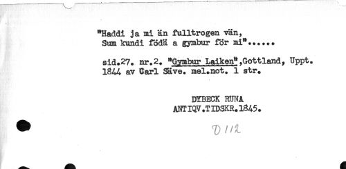 //// "Haddi ja mi än fulltrogen vän, //// Sum kundi födä a gymbur for mi"...... //// sid.27. nr. 2. "Gvmbur Laiken*. Gott land, Uppt. //// 1844 av Carl Sä ve. mel.not. 1 str. //// DYBECK RUNA //// ANTIQV.TIDSKR.18A5. //// } ////
