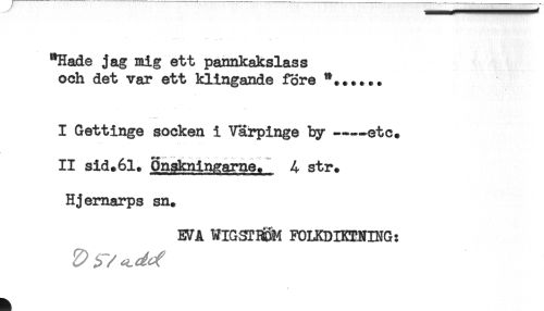 //// "Hade jag mig ett pannkakslass //// och det var ett klingande före //// I Gettinge socken i Värpinge by -—etc. //// II sid.6l. Onsknin^arne. 4 str. //// Hjemarps sn. //// EVA WIGSTBDM FOLKDIKTNING: ////