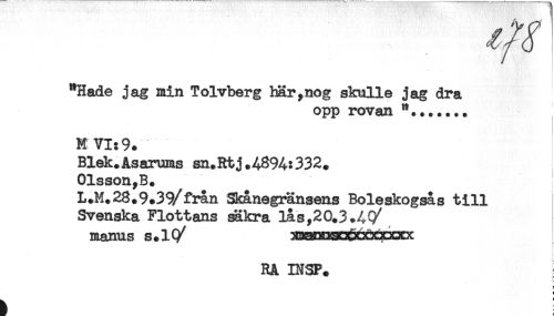 //// "Hade jag min Tolvberg här,nog skulle jag dra //// opp rovan "...*... //// K VI; 9. i //// Blek.Asarums sn.Rtj.4894:332. //// Olsson,B. //// L.M.28.9.3S/från Skånegränsens Boleskogsås till //// Svenska Flottans säkra lås,20.3.49' //// manus s.l(/ //// t //// RA INSP. //// c ////
