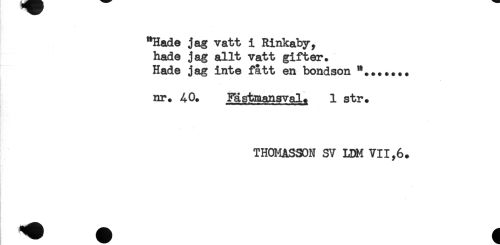 //// "Hade jag vatt i Rinkaby, //// hade jag allt vatt gifter. //// Hade jag inte fått en bondson *....... //// nr. 40. Fastiaansval. 1 str. //// TH0MASS0N SV LDM VII,6. ////