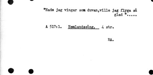 //// "Hade jag vingar son duvan,ville jag flyga sa //// glad "..*.. //// A 517:1. Hemlandssång. 4 str. //// RA. //// B ////