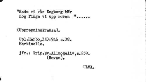 //// o //// i //// "Hade vi var Engberg, har ' //// nog finge vi upp rovan "*..... //// (Upprepningsramsa). ! //// Upl.Harbo,3Q3:946 s.38. ! //// Martinelie. //// < //// jfr.: Grip.sv.Allmogeliv,s.259. ' //// (Rovan)., //// ! //// j ////