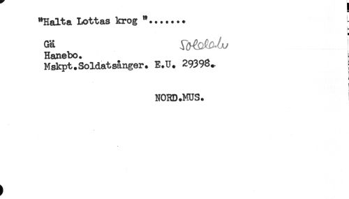 //// "Halta Lottas krog *......* //// -H //// Gä i^bMu //// Hanebo. //// Mskpt.Soldatsanger. E.U. 29398, j //// i //// i //// NORD.MUS. ////