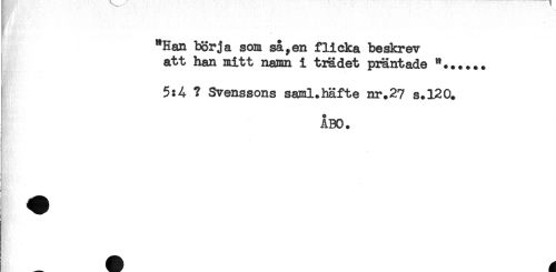 //// "Han börja som sa,en flicka beskrev //// att han mitt namn i trädet präntade "...... //// 5:4 ? Svenssons saml.häfte nr.27 s.120. //// ÅBO. //// < //// ! //// a //// ! //// J ////