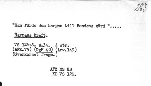 //// i //// < //// "Han förde den harpan till Bondens gård "..... //// Harpans kraft. //// VS 126:8. s.34. 4 str. //// (AFZ.75) (DgF 40) (Arv.149) //// (Överkorsat fragm.) //// AFZ MS KB //// KB VS 126. ////