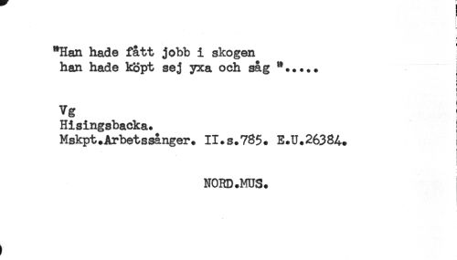 //// r //// "Han hade fått jobb i skogen ' //// han hade köpt sej yxa och såg **..... //// vg ! //// Hisingsbacka. //// Mskpt.Arbetssånger. II.s.785. E.U.26384. //// i //// i //// NORD.MUS. //// t ////