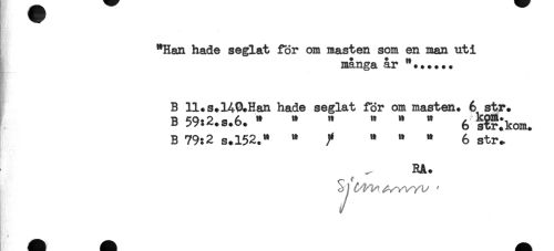 //// "Han hade seglat för om masten som en man uti //// många år "...... //// B ll.s+H9.Han hade seglat för om masten. 6 str. //// B 59:2.s.6. " ^ " " " " 6 ^Jko. //// B 79:2 s.152." " / ^ . ^ str. //// RA. //// S i ^^ ^vvvyL/ < //// / //// # ////