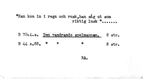 //// "Han kom in i regn och rusk,han sag ut som //// riktig lusk *....... //// B 72; g. Den vandrande spelmannen. 8 str. //// B s.88. * * " g str. //// RA. ////